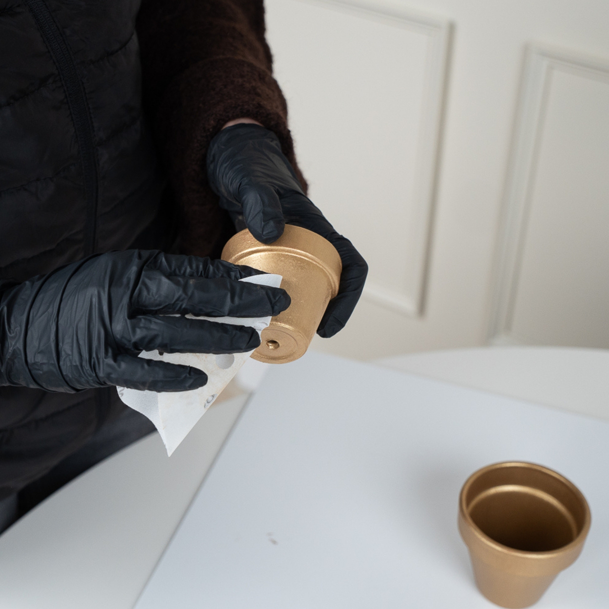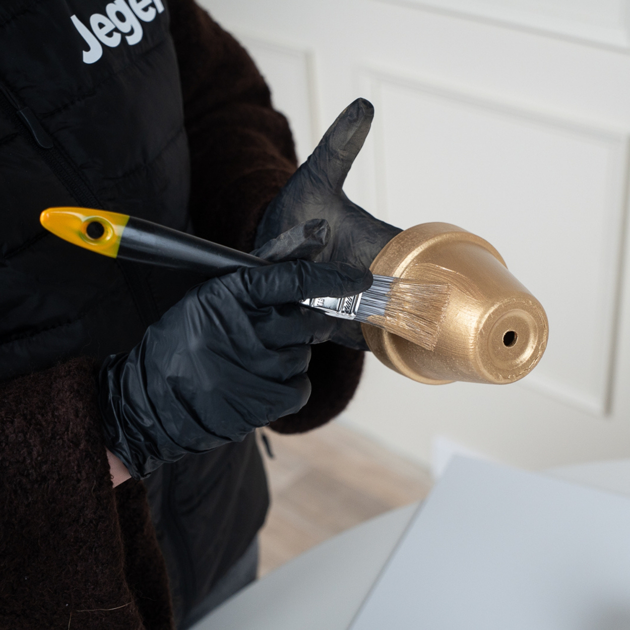 Kiedy podłoże jest odpowiednio przygotowane – czas na malowanie! Nanieś pierwszą, cienką warstwę farby Jeger Metal w kolorze starego złota. Pomaluj doniczki wewnątrz i na zewnątrz.